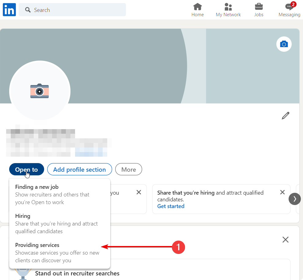 1. Go to your profile and click the “Open to” button and choose “Providing services”