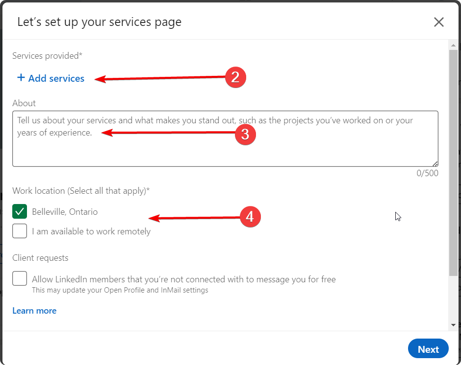 Choose services, about, and locations, and allow LinkedIn members to message you for free.
